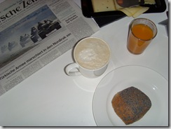 feiner Biokäse mit mikrobiellem Lab,dazu einen Multivitaminsaft, Espresso mit aufgeschäumter Sojamilch.