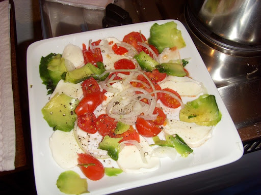 kleiner Mozarellateller mit Tomaten, Advocado und Zwiebel