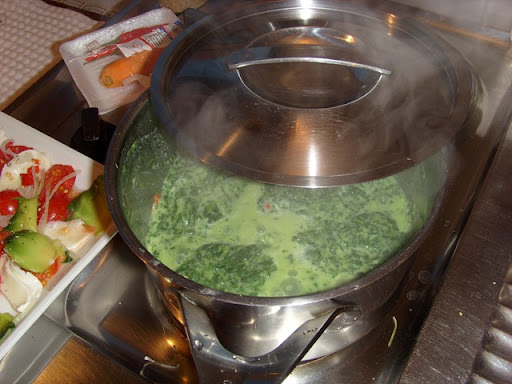 Spinat - aufgetaut - mit frischem Salbei, Sojacreme und kleiner frischer roter Chilli